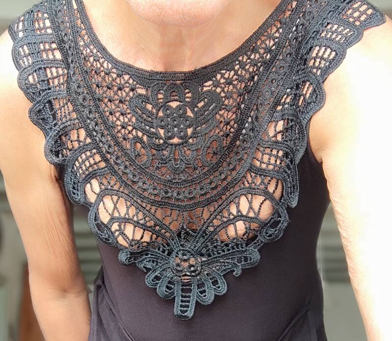 Toen ik voor de eerste keer bij een travestieten bijeenkomst was verbaasde ik me over het mooie decolleté van een aanwezige travestiet .Immers mooie borsten is mijn passie. Het belangrijkste voor mijn vrouwelijke uitingen. Ik vroeg toen aan die travestiet hoe ze toch aan die mooie spleetjes was gekomen die net boven haar mooie jurkje uitkwamen. Ze vertelde dat ze met een goede tape haar borsten naar elkaar toe trok En dan een push-up bh aantrekken. Ik heb dat ook heel veel geprobeerd. Maar bij mij laat elke keer weer het plakband los. Maar als ik nu op deze foto van me kijk. Dan ben ik best tevreden. Ik heb alleen een ondersteunende bh eronder aan. Zonder schouderbandjes dus.