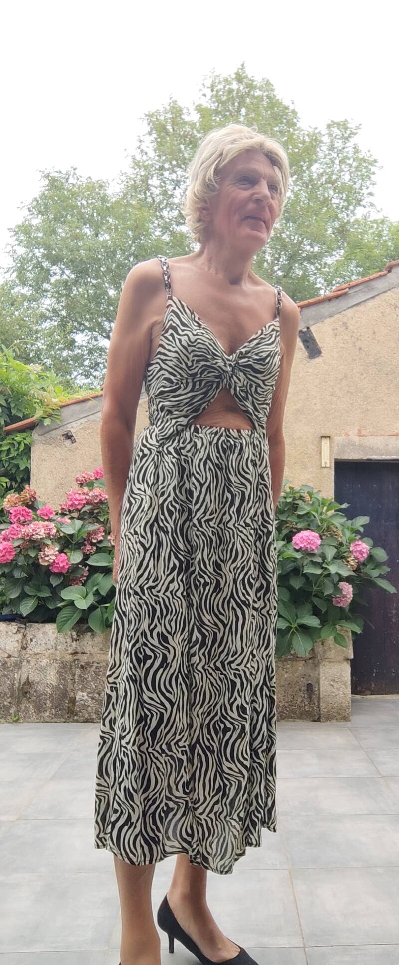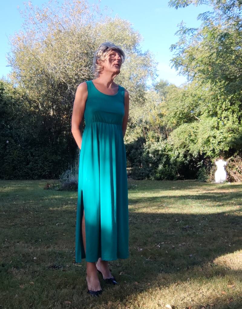 Dit is een jurk waarin ik me ook zo lekker vrouwelijk voel. Vanmorgen dacht ik dat deze jurk ook maar eens op de foto moest. Het was nog steeds mooi weer. Dus ideaal om dit te doen. Op het moment dat ik de foto op de weg maak, zie ik onze buurvrouw de weg over steken. Die heeft weer wat over te roddelen. Maar met pruik op en hakjes aan en op afstand heeft ze me denk ik niet herkend.