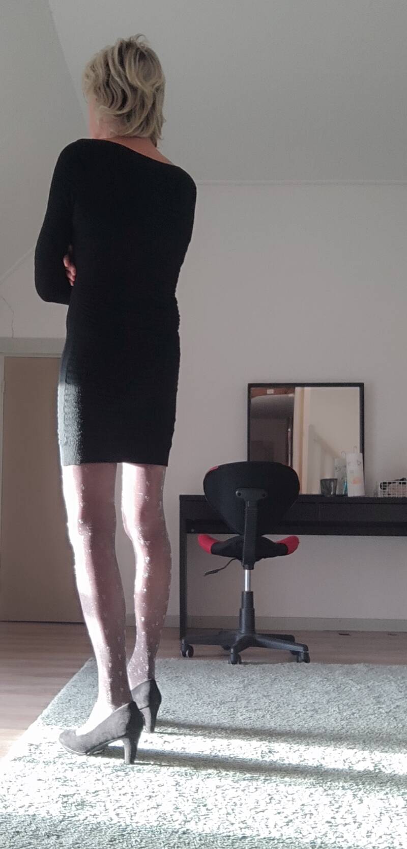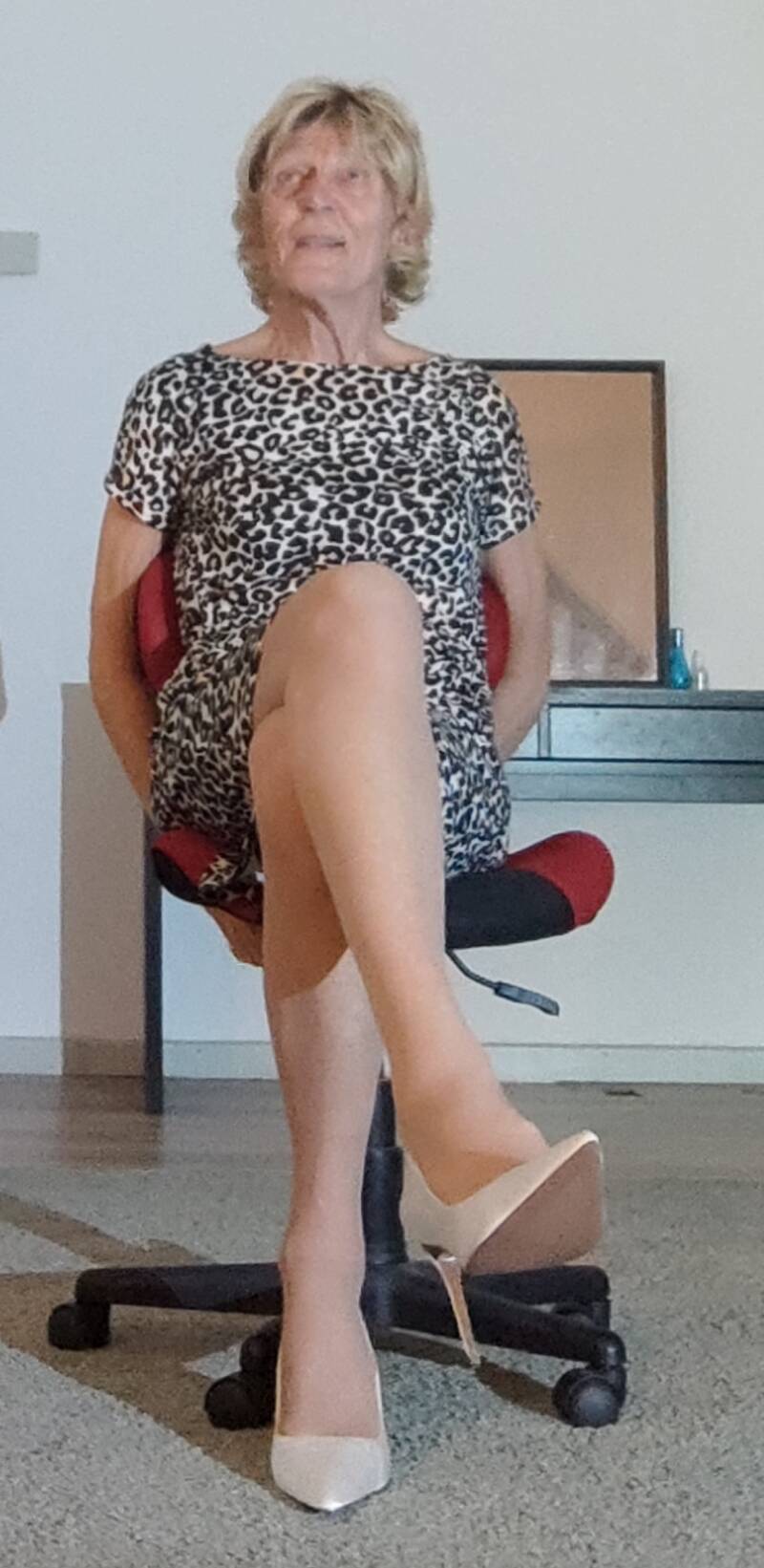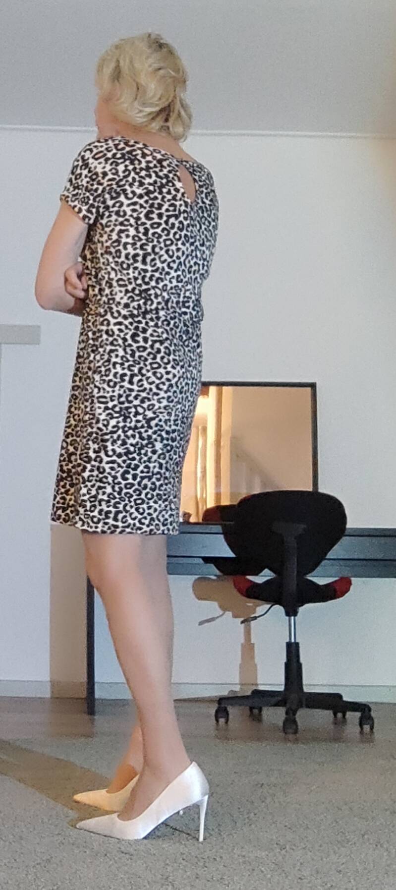 Weer een jurkje dat ik samen met mijn vrouw heb gekocht. Niet ver van waar wij wonen is in een redelijk grote stad een Kiabi kleding winkel. Ik vind het heerlijk als mijn vrouw dar iets nieuws wil kopen. Ik zie er dan natuurlijk ook van alles hangen dat ik wel zou willen kopen. Toen ik dit jurkje zag en tegen haar een opmerking maakte dat ik dat wel erg mooi vond zij ze koop het dan. Toen ik het die avond thuis in de kamer aan had vond ze het toch wel veel te kort voor mijn leeftijd. Maar ik vind het toch altijd weer heerlijk om mijn lange benen te laten zien.